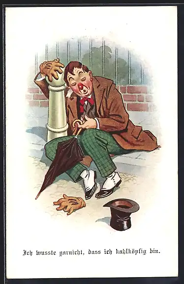 AK Betrunkener sitzt auf der Strasse und umarmt einen Poller, Trinkerhumor