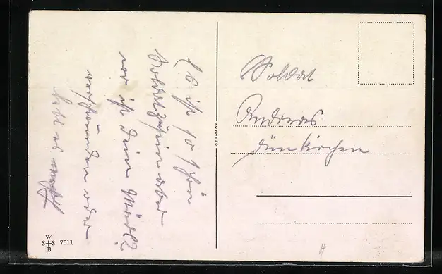 Personenbezogene Daten auf der Rückseite der Karte wurden durch blauen Textmarker unkenntlich gemacht. Die blauen Stellen sind auf die Vorderseite durchgeweicht und wirken sich negativ auf das Postkartenfoto aus