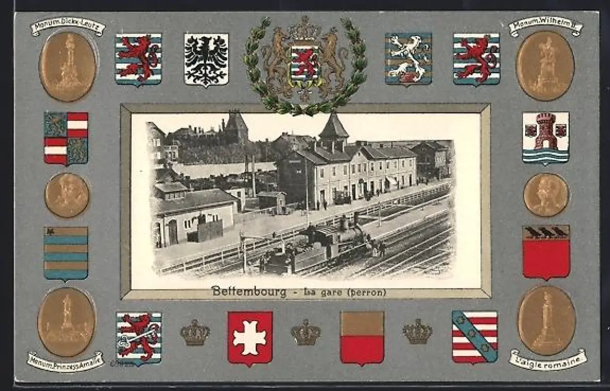 AK Bettembourg, La gare Gleisseite, Wappen und Monumente