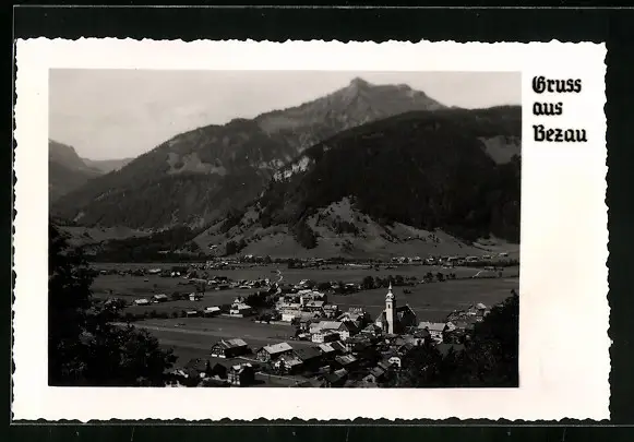 AK Bezau, Ortsansicht mit Bergspitze von oben