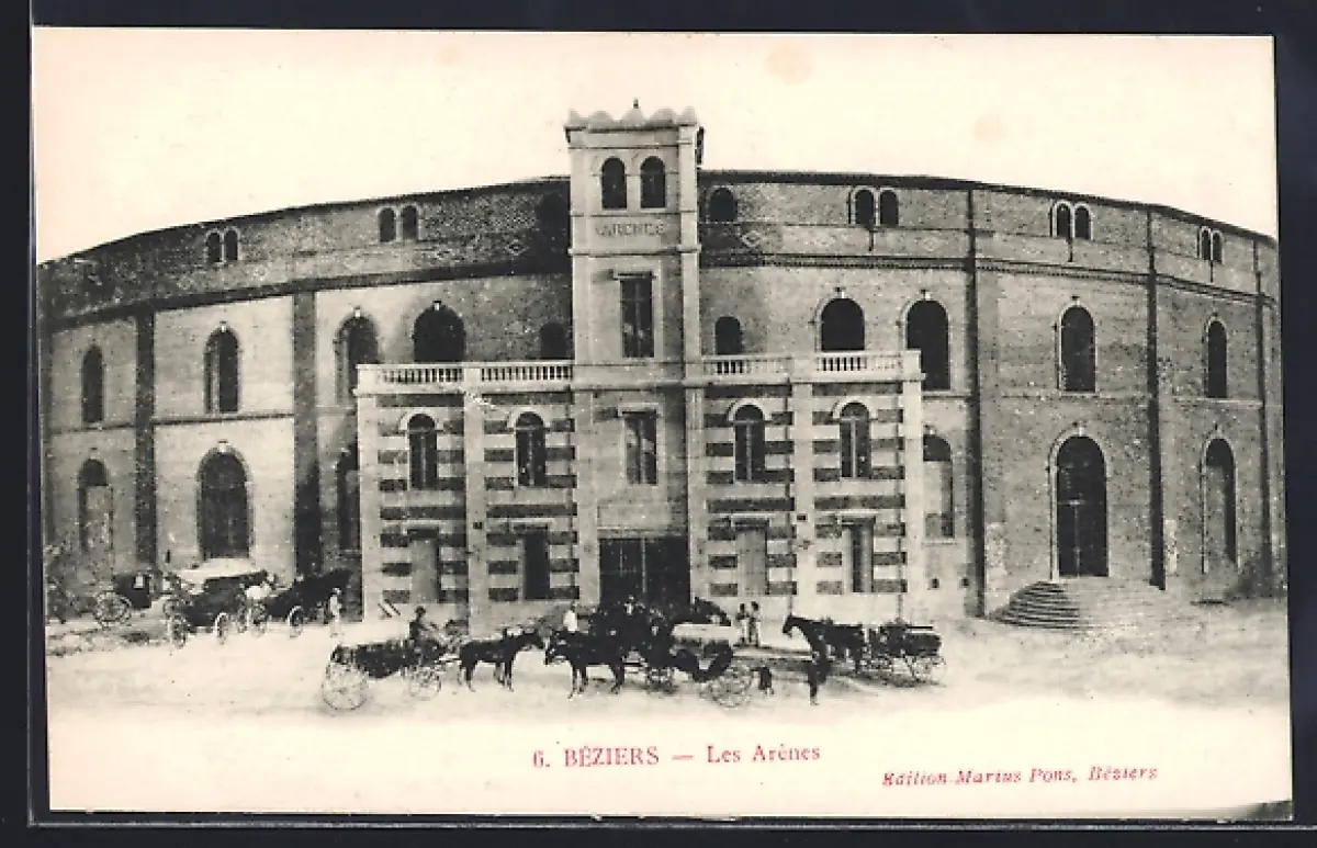AK Béziers, Les Arènes et attelages devant l`entrée principale