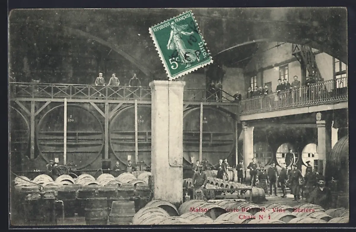 AK Béziers, Maison du Vin Boyer, Chai N°1 avec tonneaux et ouvriers