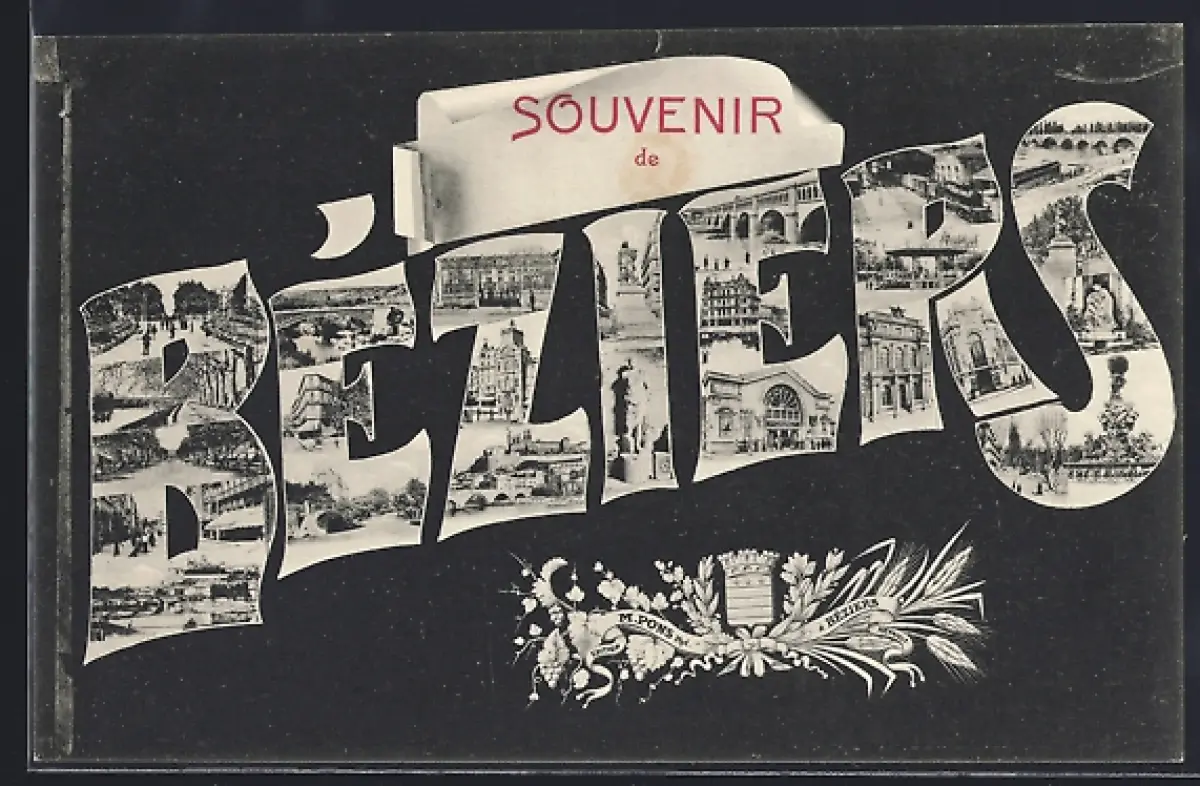 AK Béziers, Souvenir de Béziers avec vues intégrées dans le texte