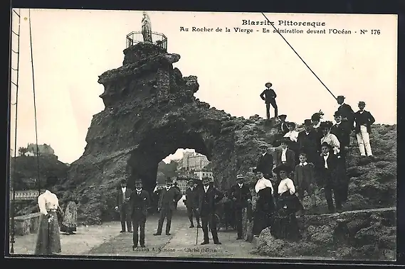 AK Biarritz, Au Rocher de la Vierge, En animation devant l`Océan, N° 176