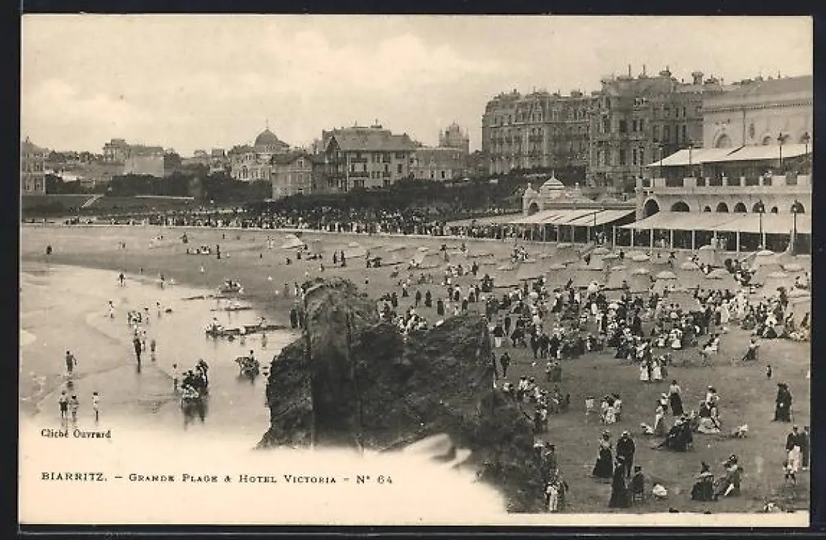 AK Biarritz, Grande Plage et Hôtel Victoria, vue animée de la plage et des bâtiments historiques