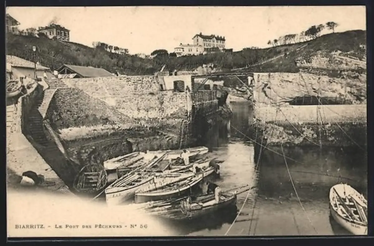 AK Biarritz, Le Port des Pêcheurs avec bateaux amarrés et vue sur les collines