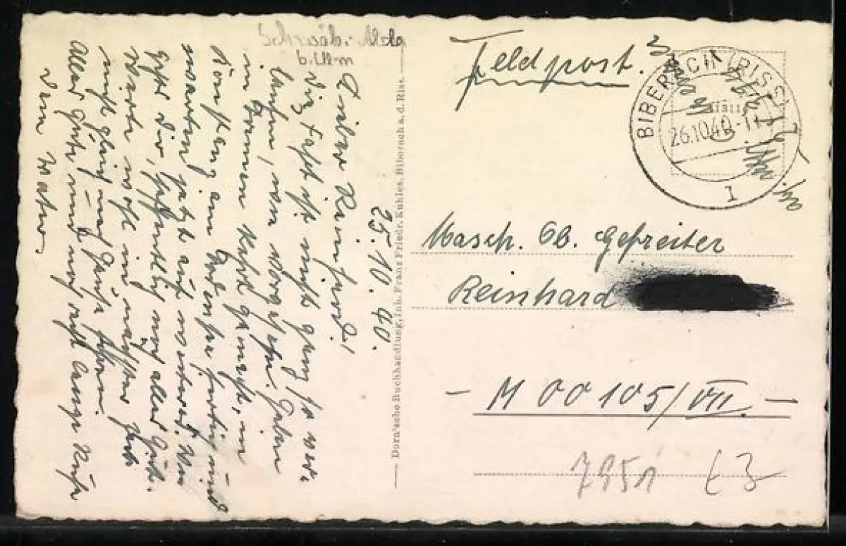 Personenbezogene Daten auf der Rückseite der Karte wurden durch blauen Textmarker unkenntlich gemacht. Die blauen Stellen sind auf die Vorderseite durchgeweicht und wirken sich negativ auf das Postkartenfoto aus