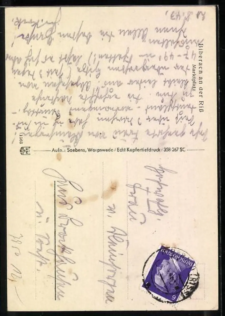 Personenbezogene Daten auf der Rückseite der Karte wurden durch blauen Textmarker unkenntlich gemacht. Die blauen Stellen sind auf die Vorderseite durchgeweicht und wirken sich negativ auf das Postkartenfoto aus