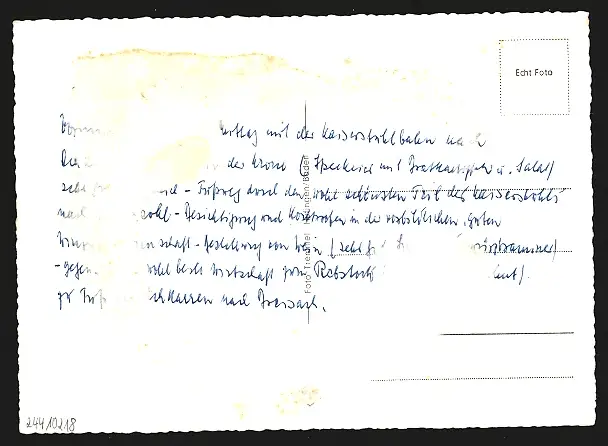 Personenbezogene Daten auf der Rückseite der Karte wurden durch blauen Textmarker unkenntlich gemacht. Die blauen Stellen sind auf die Vorderseite durchgeweicht und wirken sich negativ auf das Postkartenfoto aus