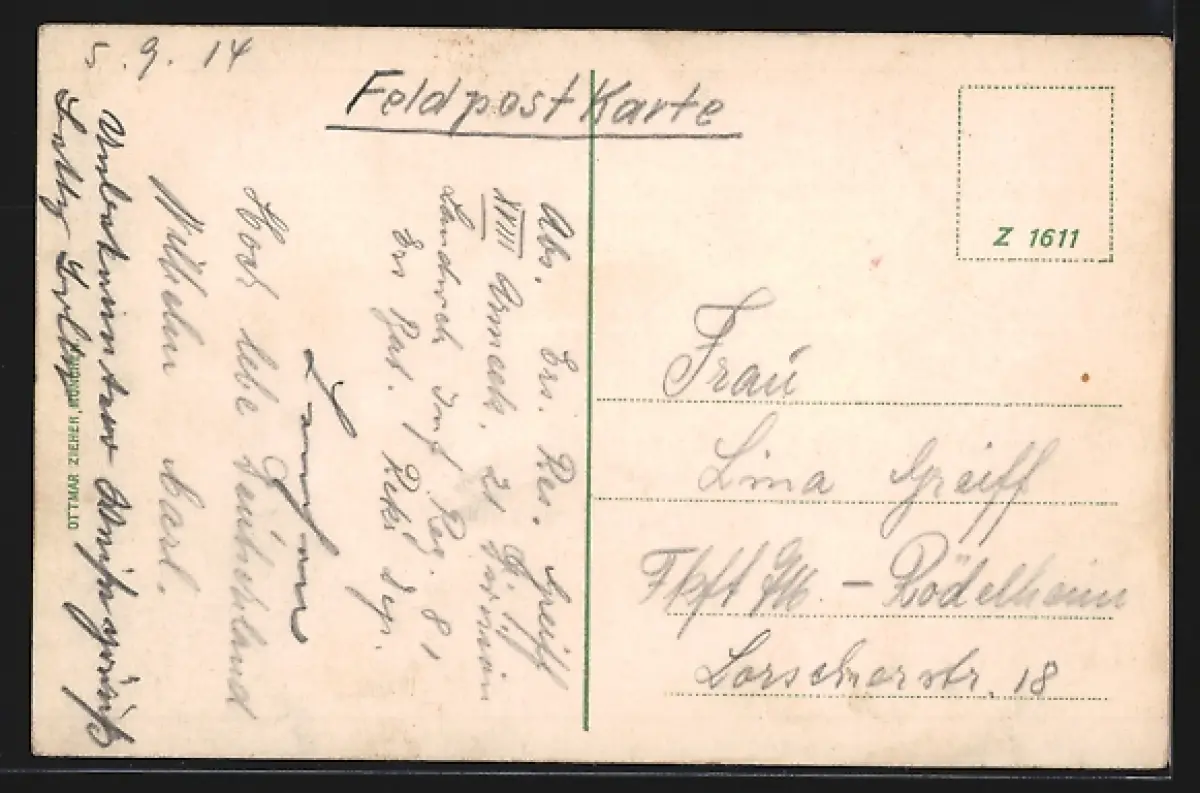 Personenbezogene Daten auf der Rückseite der Karte wurden durch blauen Textmarker unkenntlich gemacht. Die blauen Stellen sind auf die Vorderseite durchgeweicht und wirken sich negativ auf das Postkartenfoto aus