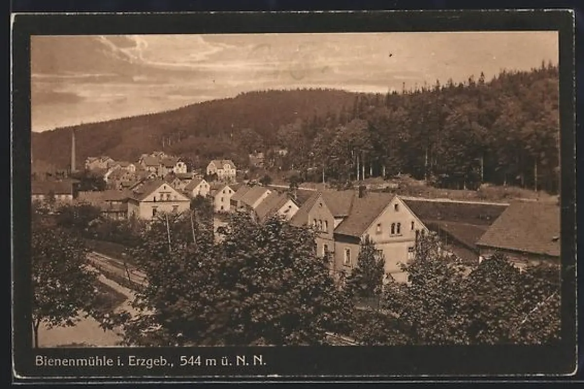 AK Bienenmühle i. Erzgeb., Ortsansicht mit Wohnhäusern und Wald