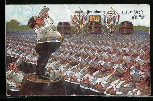AK Biertrinker bei der Freiübung mit Massbieren, 1 - 2 - 3 Prost g'suffa