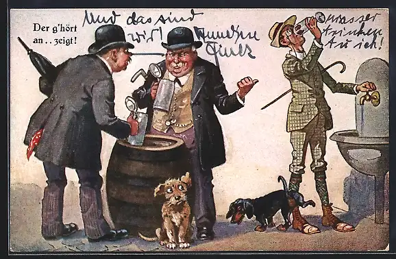 AK Biertrinker machen sich über den Mann mit dem Wasserglas lustig, Dackel pinkelt ihm ans Bein, Trinkerhumor