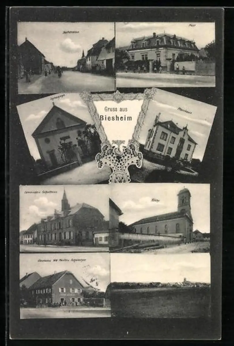 AK Biesheim, Synagoge, Dorfstrasse, Gasthaus Ww. Pauline Schweitzer, Post, Dorfstrasse