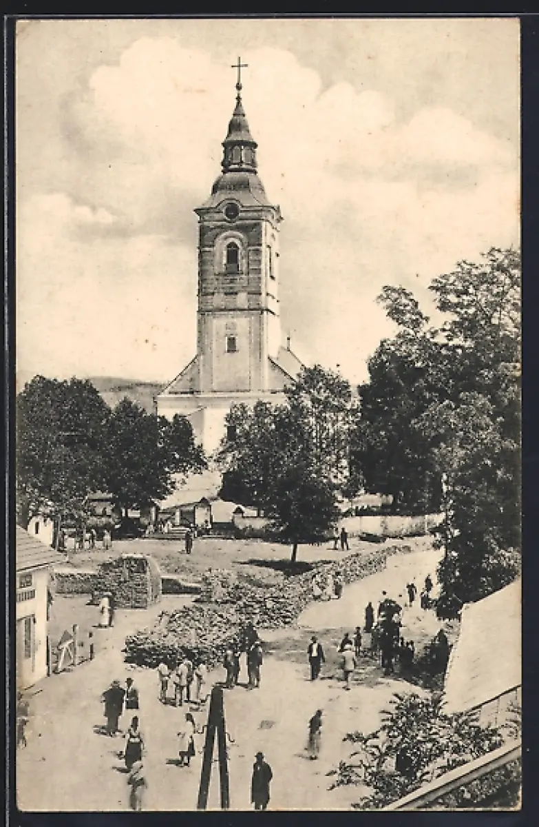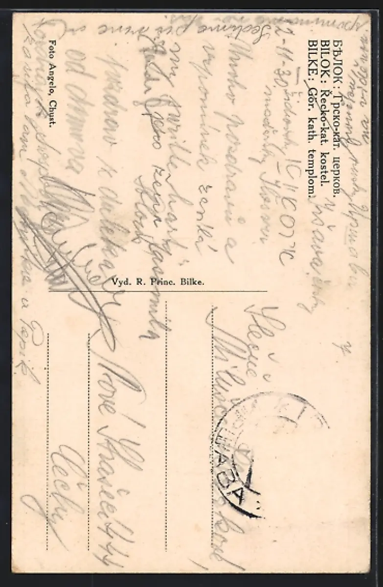 Personenbezogene Daten auf der Rückseite der Karte wurden durch blauen Textmarker unkenntlich gemacht. Die blauen Stellen sind auf die Vorderseite durchgeweicht und wirken sich negativ auf das Postkartenfoto aus