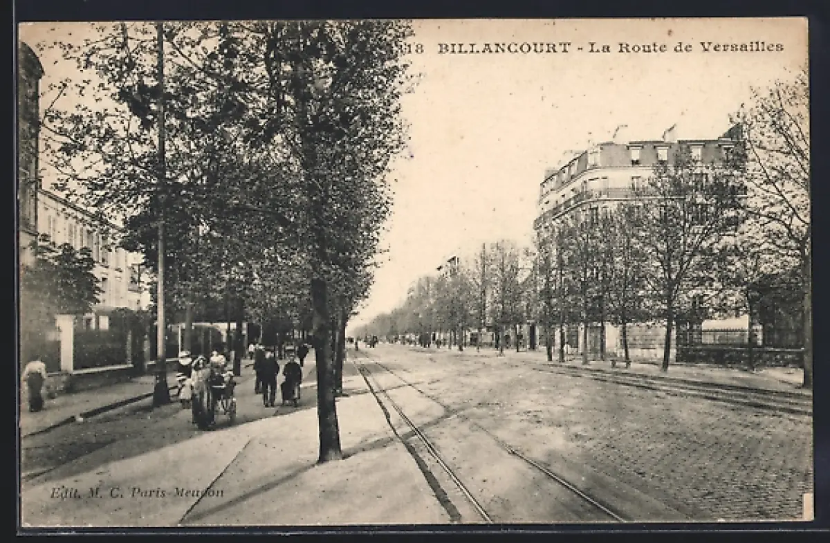 AK Billancourt, La Route de Versailles avec passants et bâtiments adjacents