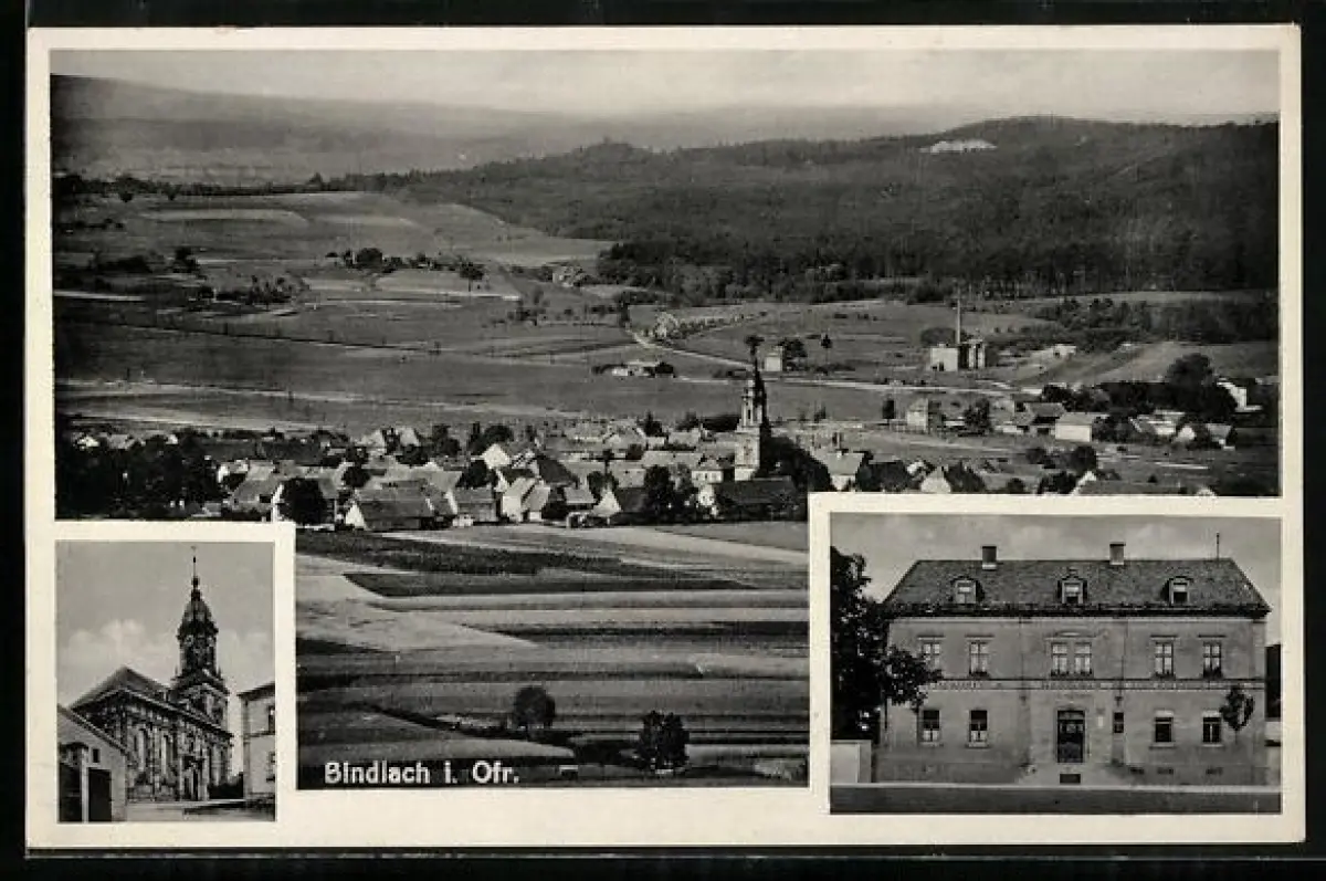 AK Bindlach i. Ofr., Gasthaus zum goldenen Löwen, Kirche, Ortsansicht aus der Vogelschau