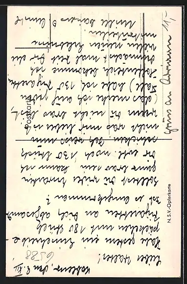 Personenbezogene Daten auf der Rückseite der Karte wurden durch blauen Textmarker unkenntlich gemacht. Die blauen Stellen sind auf die Vorderseite durchgeweicht und wirken sich negativ auf das Postkartenfoto aus