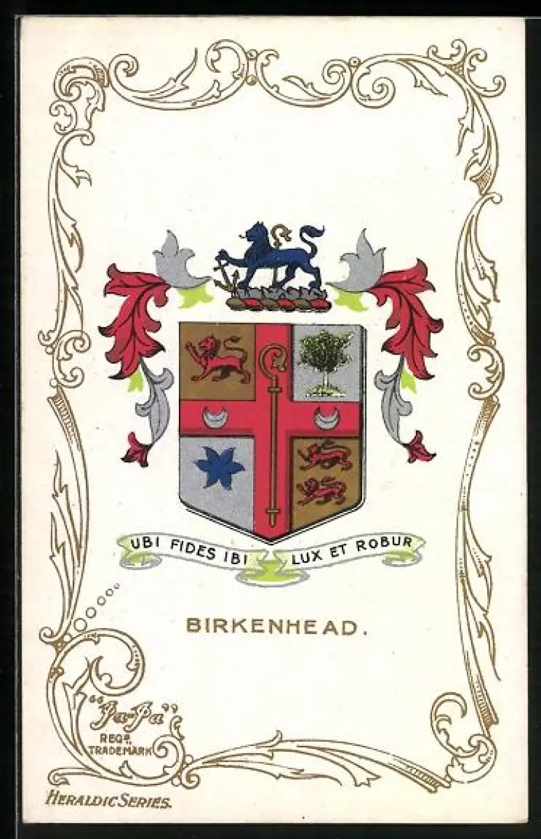 AK Birkenhead, Wappen u. Ornament-Rahmen