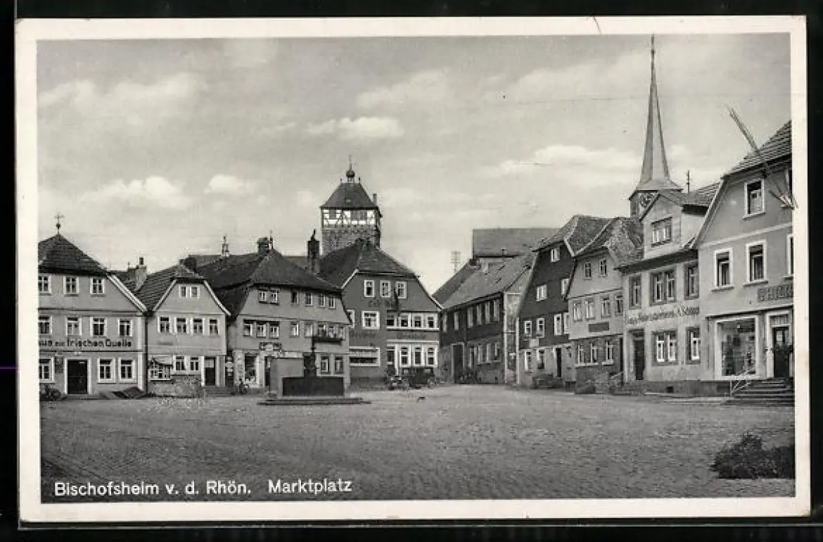 AK Bischofsheim v. d. Rhön, Marktplatz mit Gasthaus zur frischen Quelle und Geschäften
