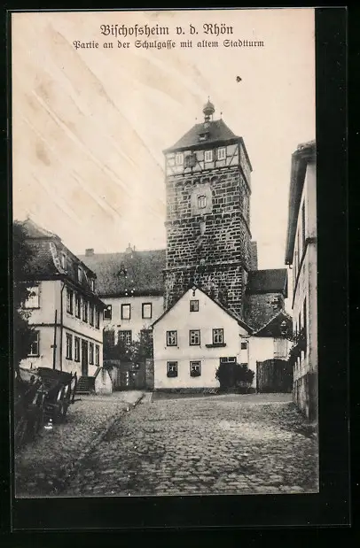AK Bischofsheim v. d. Rhön, Strassenpartie an der Schulgasse mit altem Stadtturm