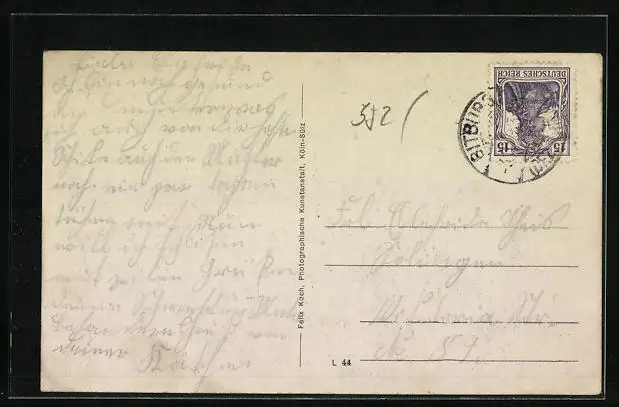 Personenbezogene Daten auf der Rückseite der Karte wurden durch blauen Textmarker unkenntlich gemacht. Die blauen Stellen sind auf die Vorderseite durchgeweicht und wirken sich negativ auf das Postkartenfoto aus