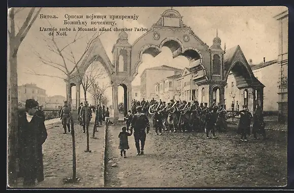 AK Bitola, L`armée serbe à Monastir allant chercher l`arbre de Noel