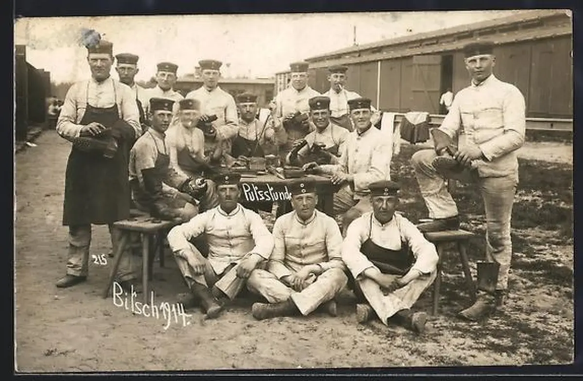 AK Bitsch, Groupe de soldats posant devant des baraquements en 1914