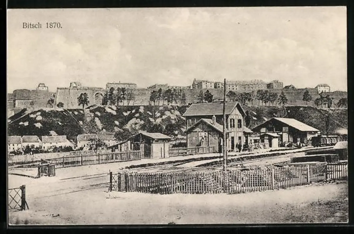 AK Bitsch, Ortsansicht mit Bahnhof im Jahr 1870