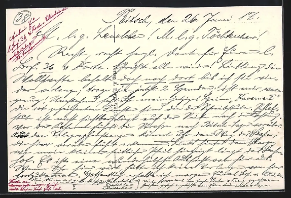 Personenbezogene Daten auf der Rückseite der Karte wurden durch blauen Textmarker unkenntlich gemacht. Die blauen Stellen sind auf die Vorderseite durchgeweicht und wirken sich negativ auf das Postkartenfoto aus