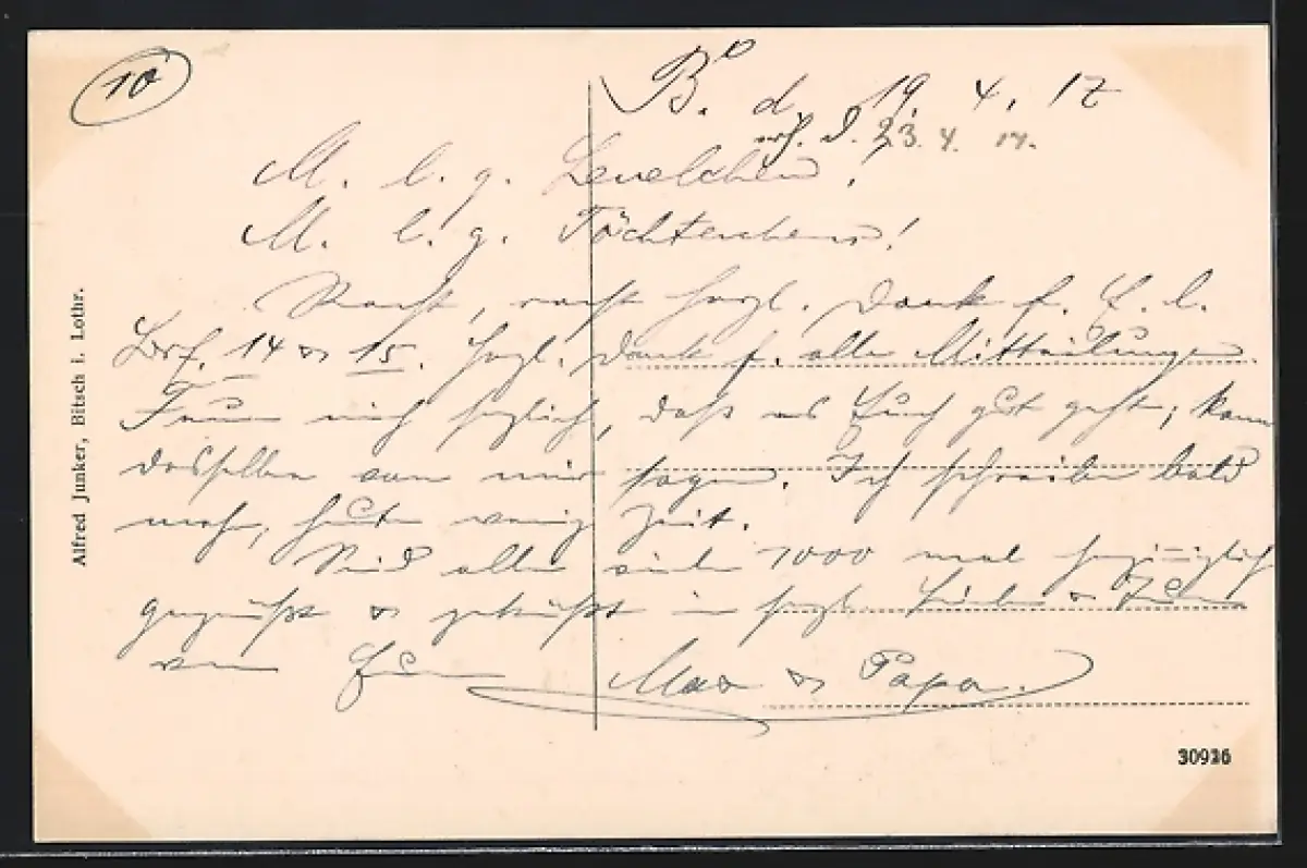 Personenbezogene Daten auf der Rückseite der Karte wurden durch blauen Textmarker unkenntlich gemacht. Die blauen Stellen sind auf die Vorderseite durchgeweicht und wirken sich negativ auf das Postkartenfoto aus