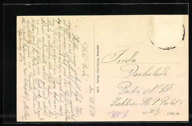 alte Ansichtskarte, gelaufen 1917, Briefmarke entfernt, rückseitig Oberflächenschaden, Eckknicke re. oben u. li., guter Zustand