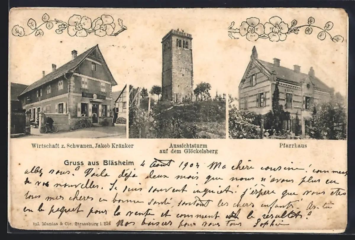 AK Bläsheim, Gasthaus zum Schwanen, Bes. Jakob Kränker, Aussichtsturm auf dem Glöckelsberg, Pfarrhaus