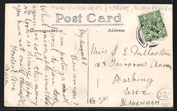 Personenbezogene Daten auf der Rückseite der Karte wurden durch blauen Textmarker unkenntlich gemacht. Die blauen Stellen sind auf die Vorderseite durchgeweicht und wirken sich negativ auf das Postkartenfoto aus