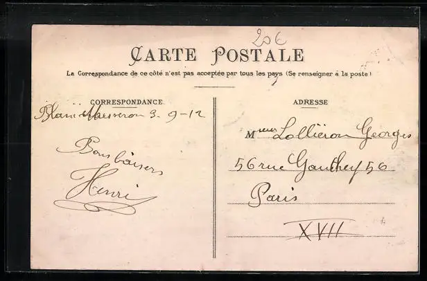 Personenbezogene Daten auf der Rückseite der Karte wurden durch blauen Textmarker unkenntlich gemacht. Die blauen Stellen sind auf die Vorderseite durchgeweicht und wirken sich negativ auf das Postkartenfoto aus