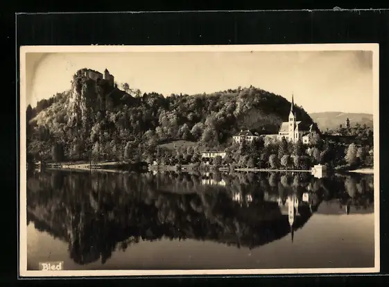 AK Bled, Spiegelglatte Seeoberfläche, Panorama, Kirche, Feste