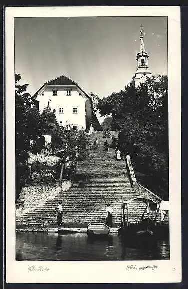 AK Bled, Treppe am Ufer, Blick zur Kirche
