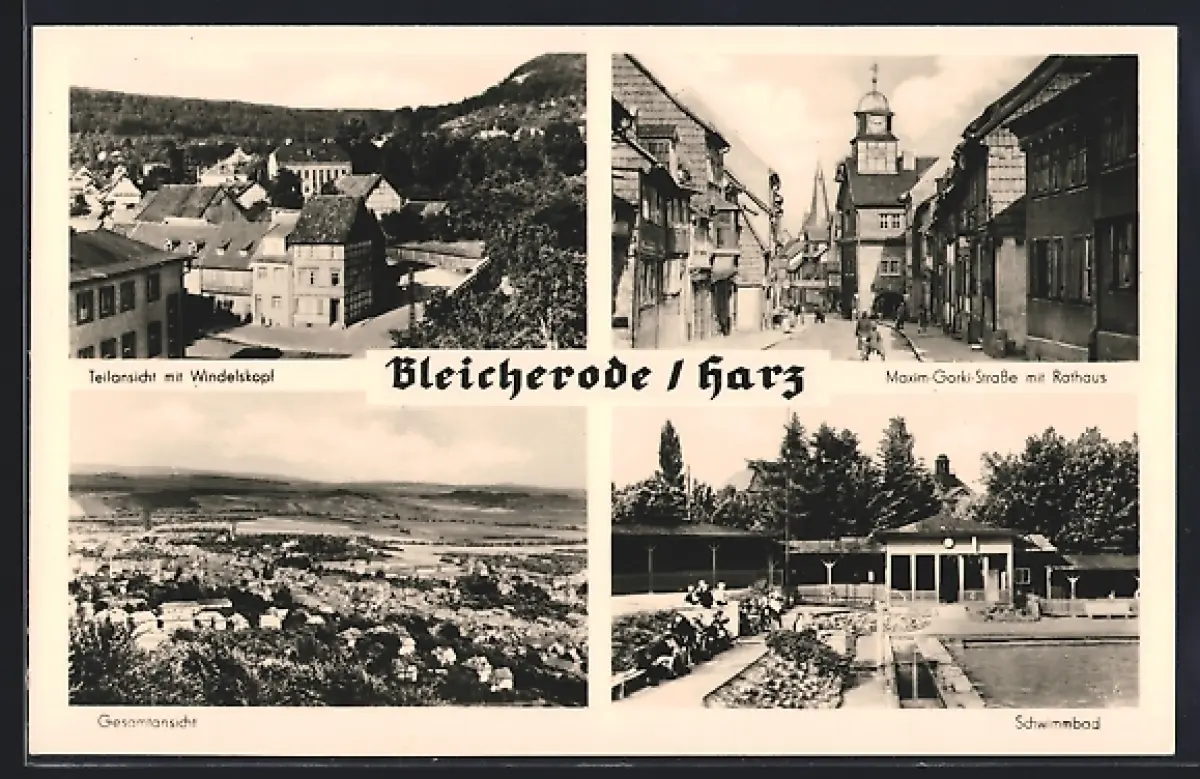 AK Bleicherode /Harz, Teilansicht mit Windelskopf, Maxim-Gorki Strasse mit Rathaus, Schwimmbad