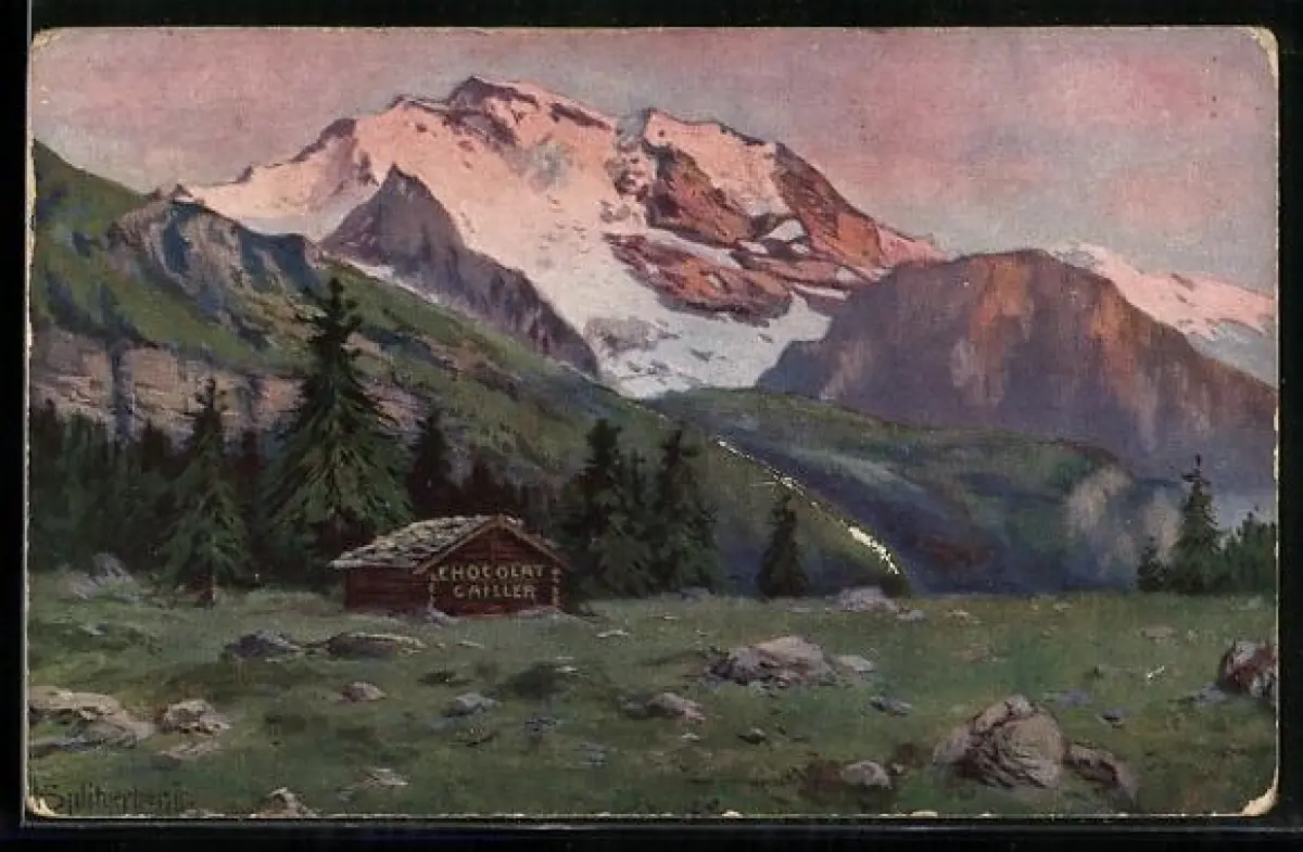 AK Blick in die Alpen mit Berghütte, Schokoladenfirma Cailler