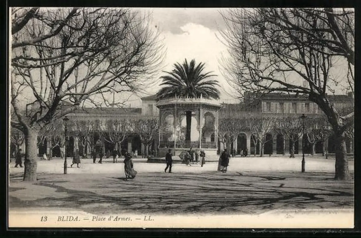 AK Blida, la place d`Armes, le kiosque, quelques passants, les arbres sans feuilles