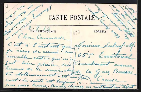Personenbezogene Daten auf der Rückseite der Karte wurden durch blauen Textmarker unkenntlich gemacht. Die blauen Stellen sind auf die Vorderseite durchgeweicht und wirken sich negativ auf das Postkartenfoto aus