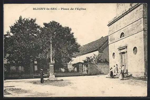 AK Bligny-le-Sec, Place de l`Église avec des habitants conversant devant l`église