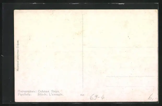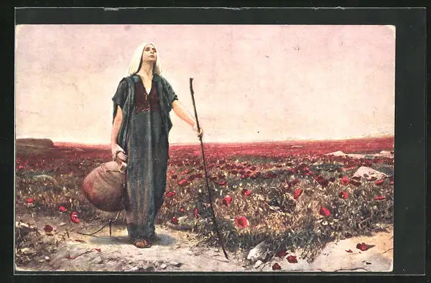 AK Blinde mit Stock und einem Krug an einer Blumenwiese
