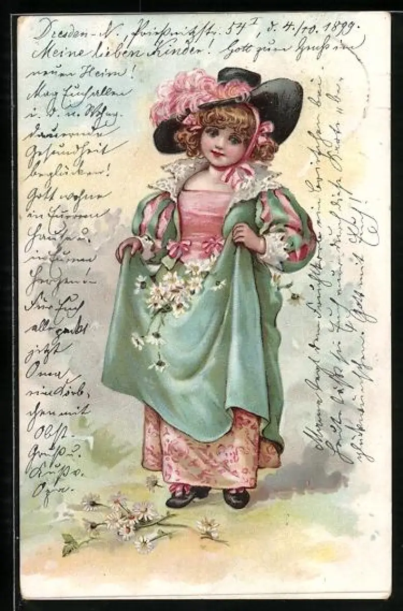 AK Blondes Mädchen in eleganter Kleidung und Hut trägt Gänseblümchen in ihrem Rock