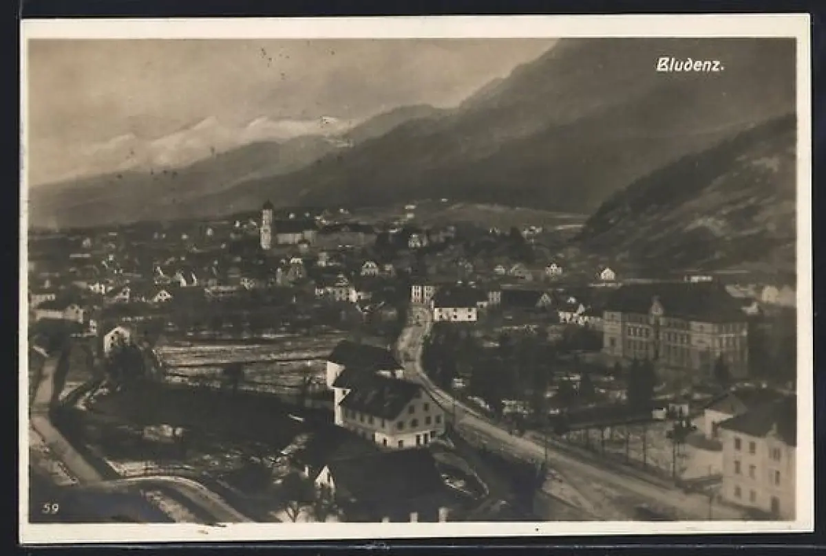 AK Bludenz, Ortsansicht mit Kirche aus der Vogelschau
