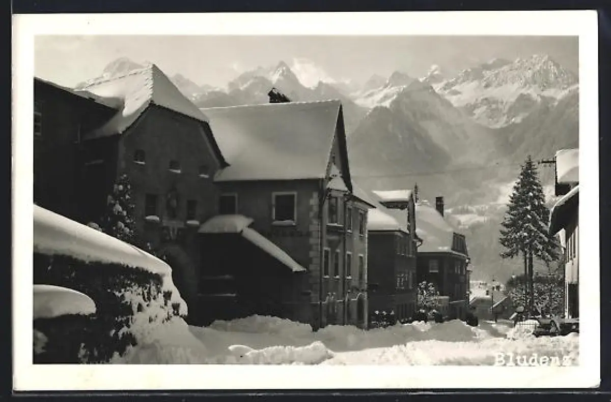 AK Bludenz, Ortspartie im Winter mit Bergpanorama