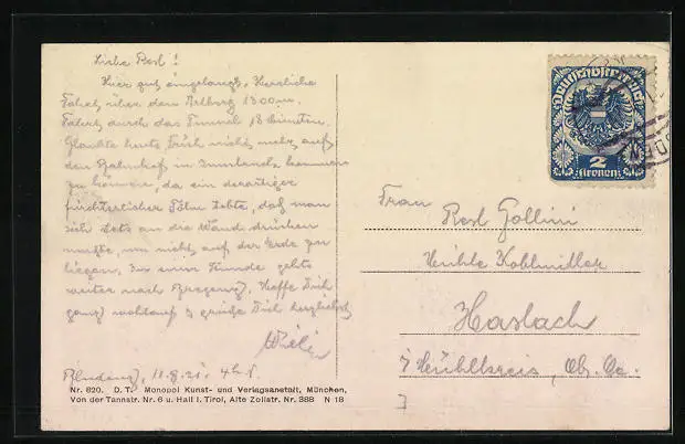 Personenbezogene Daten auf der Rückseite der Karte wurden durch blauen Textmarker unkenntlich gemacht. Die blauen Stellen sind auf die Vorderseite durchgeweicht und wirken sich negativ auf das Postkartenfoto aus