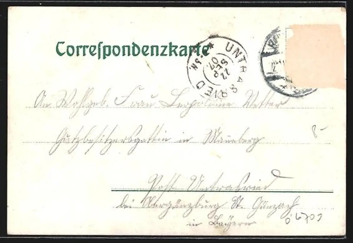 alte Ansichtskarte, gelaufen 1907, Briefmarke entfernt, rückseitig Oberflächenschaden, guter Zustand
