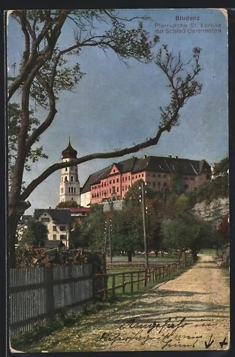 AK Bludenz, Pfarrkirche St. Lorenz mit Schloss Gaienhofen