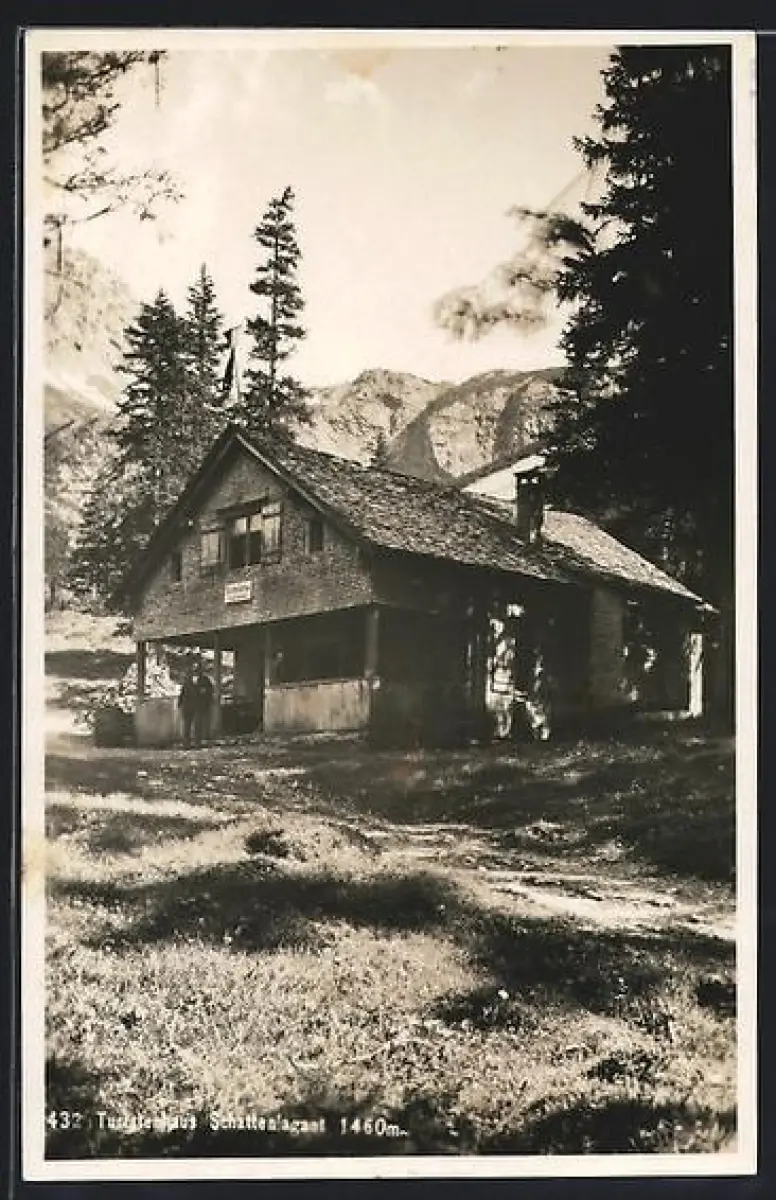 AK Bludenz, Schattenlagant, Mann vor dem Turistenhaus